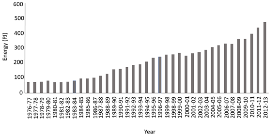 Figure 1.1: Energy consumption by the mining industry in Australia from 1976 through to 2013 (EY, 2014 and references therein).