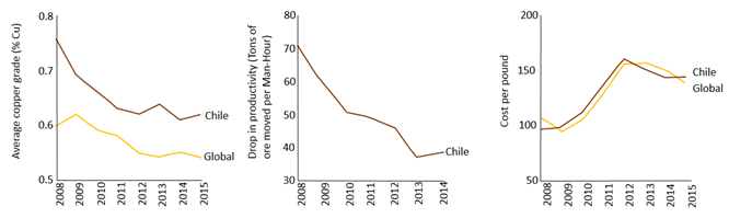Figure 1.3: Plots of average copper grade, productivity and mine costs for Chile. Decreases in grade and productivity and rising costs are all motivational drivers to change in the way mining is done in the country.  Improvements to energy efficiency and increased renewable energy use in mine operations. (COMPAÑÍA MINERA DOÑA INÉS DE COLLAHUASI, 2016).