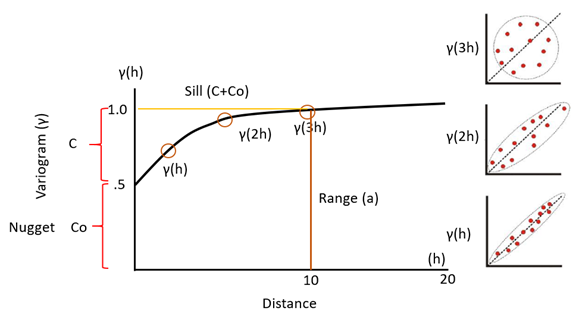 Variogram of γ(h) (figure 5, equation 1) measures the half average square difference between paired data value separated by some distance, and with increase lag distance, 2γ(h) and 3γ(h) are determined as represented by the brown circles in figure 5, this continues until there is no more sample autocorrelation and the variogram levels off.