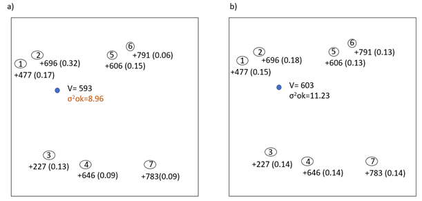 Figure 6: Ordinary kriging result showing a) kriging with no nugget effect where the range of weight assigned is between 0.06 to 0.32 b) kriging with pure nugget effect of 50% with weight range of 0.13 to 0.18. Modified from Isaaks and Srivastava, 1989).