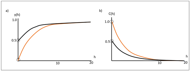 Range: A distance at which the semivariogram reaches the sill value. At this point, autocorrelation of samples is zero. Range is defined as (a)