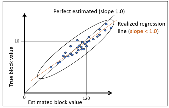 The higher the nugget effect the greater the smoothing of the estimate. Therefore, to improve relationship between true and estimate value, It is possible to calculate regression slope of >0.95 as minimum slope for grade estimation efficiency by simply changing the block size, composite length and optimizing the number of samples used in the estimation (Krige, 1997; Voortman, 1997). Because nugget is isotropic, the effect of nugget can be lowered by increasing sample support.