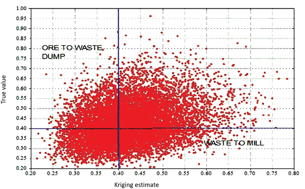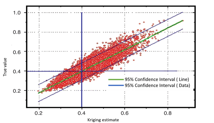 True value is only possible if after estimation, the deposit is subsequently mined, and those grades are then plotted against the block grade. If the true value on the y (axis) and block value on the x (axis) matches well at 45% which has a slope of 1, the deposit is consider free of estimation error. If on the other hand it deviates from 45 degree, it points to error or conditional estimation bias, Figure 8. In most deposits where there is no historical mining grade, cross validation model is used. Cross validation would require variogram model, minimum and maximum sample, the output model is then plotted against the estimated grade.