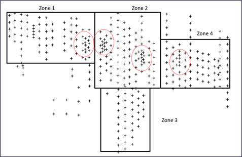 Figure 1: Regular and irregular (within red circle) drilling of uranium deposit in Saskatchewan. Modified from David, 1988.