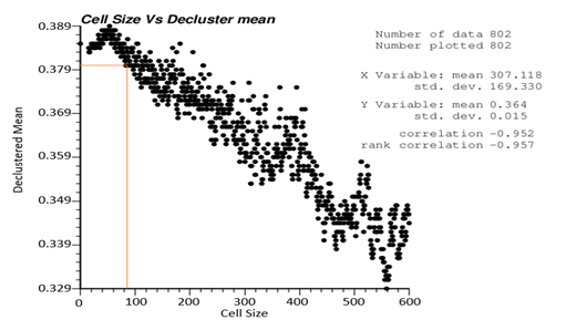 When debiasing the data, the best possible option is also to plot the declustered mean verses cell size and select the cell size that is appropriate for data distribution in X, Y and Z direction (figure 2).