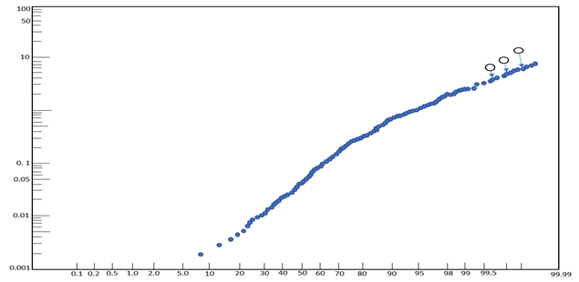 If a retested sample failed to confirm the original assay, it is considered an outlier and, in this case the sample should be documented and removed. Experts differ on how to treat extreme but confirming sample. Some prefer to cap the grade between 99.5% to 99.9% at the top of cumulative frequency distribution curve where the data disintegrates (Figure 4), while others follow the local custom of capping the grade at 1 oz/t or 28.35 g/t (Babakhani, 2014). The importance of the outlier is summarized in David (1988), particularly where the ore is custom milled by another company. If the company milling thinks the grade should be capped at certain grade, the company producing the ore is most probably cheated for resources. Cutting down outliers to a certain grade is the same logic as getting rid of the last cart on train carrying ore.
